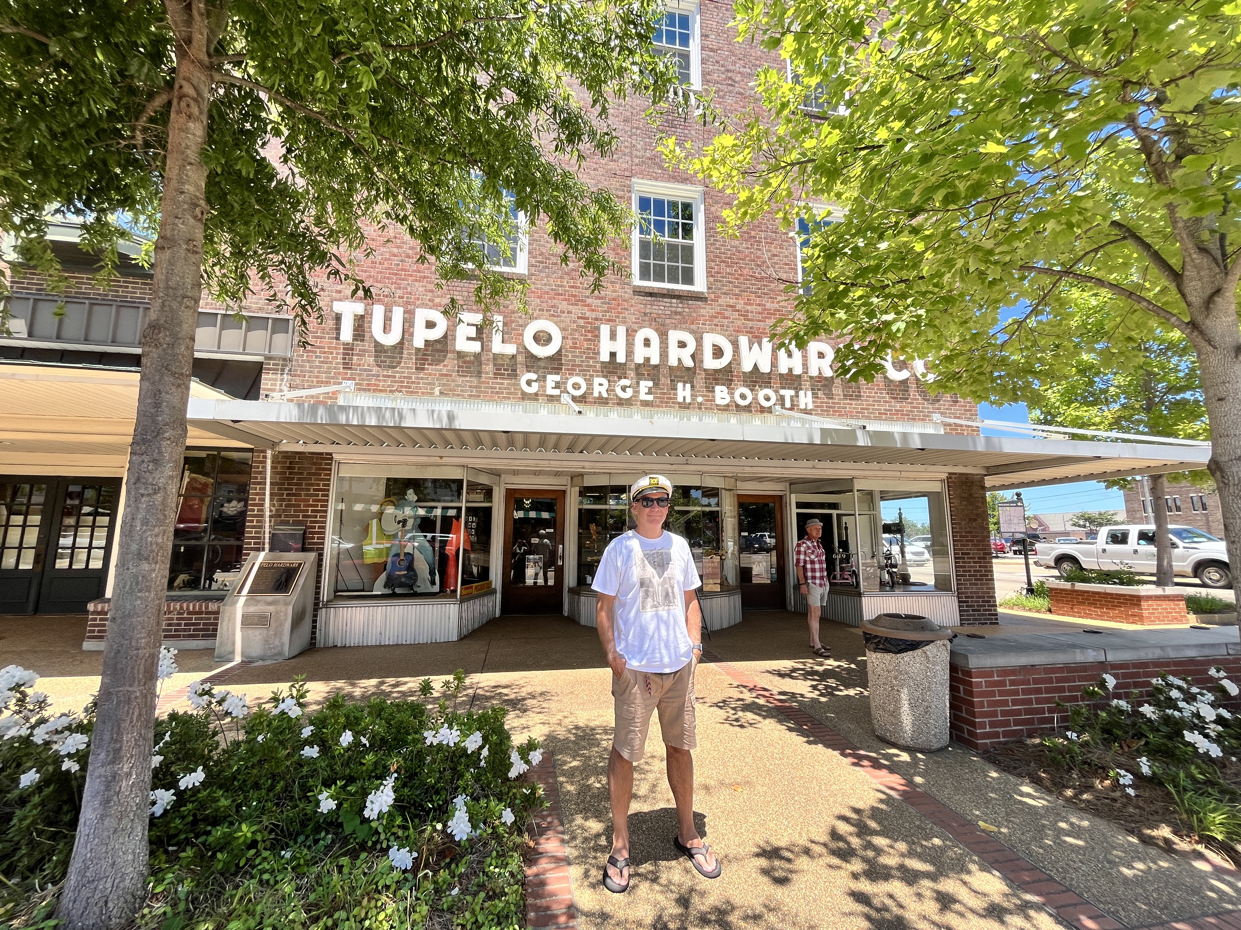 In Tupelo, we had lunch at Johnnie’s Drive-in, a great authentic burger joint that apparently once had young Elvis as a customer. Portions are not huge but the food is dirt cheap. And a first for me was a stop in downtown Tupelo, a stretch that is immaculate, having been cleaned up nicely. Still as it once was though is the Tupelo Hardware Store where Gladys bought Elvis his first guitar. No small thing. There is an X on the floor where little King stood.