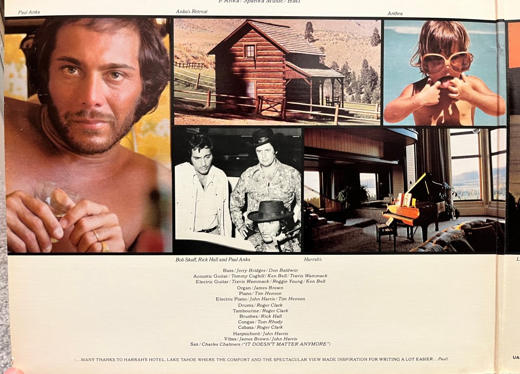 By the early 70s, Anka was a fixture in showrooms throughout Nevada and – as a guaranteed filler of seats and a good earner – he received an invitation from Bill Harrah. Harrah’s Lake Tahoe had opened a brand new structure in November of ’73 and in 1974 Harrah offered Paul a place in which to create. Anka accepted and then was able to write the bulk of his next album in a beautiful space looking out on Lake Tahoe. The record, Paul’s 12th and first for United Artists, would be called simply Anka.