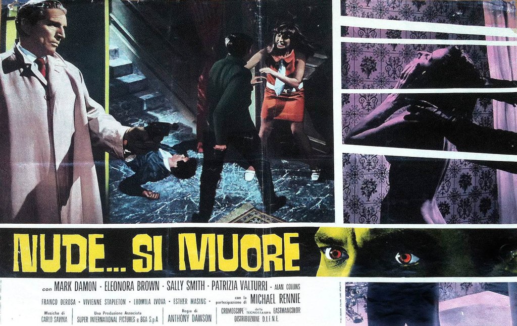 Nude… si muore is a giallo film. The giallo genre is said to have its origins in Mario Bava’s 1963 The Girl Who Knew Too Much and the films are basically characterized as suspenseful murder mysteries with graphic and sometimes sensational violence and a certain measure of sex including full and partial nudity. They often border on horror and invariably feature a mysterious killer who is not revealed until the final moments. The genre is considered to be a precursor to the slasher film, movies that took giallo‘s foundations and amplified the horror and gore. A giallo to me features sharp objects and quantities of bright red blood but Nude…si muore features strangulations which make the film a more tame entry in the genre. But there is no shortage of atmosphere and suspense, the settings, sets and the ladies wardrobes are nice and the surprise ending is legit. Speaking of wardrobes and just so you know, I read a review of this film with the comical heading “Fully Clothed You Die”. So, that tells you something about the lack of nudity here.