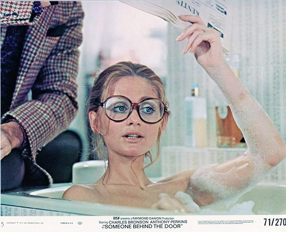 At the beginning of Quelqu’un derrière la porte, a disoriented man (Bronson) is brought to a hospital by a cabbie who found him wandering aimlessly. Just finishing a long night shift at the hospital is neurosurgeon and psychiatrist Dr. Laurence Jeffries (Perkins) who seizes the opportunity to take the amnesiac man home where he gives him a sedative and sends him to bed in the guest room. The doctor then goes upstairs where his wife, Frances (Ireland), is just waking. Their conversation reveals their mutual suspicion and Frances leaves on a trip to visit her brother. Dr. Jeffries knows, however, that she is carrying on an affair. Alone now in the house, the man he has brought home from the hospital emerges from his room and Dr. Jeffries begins to put his plan into motion.