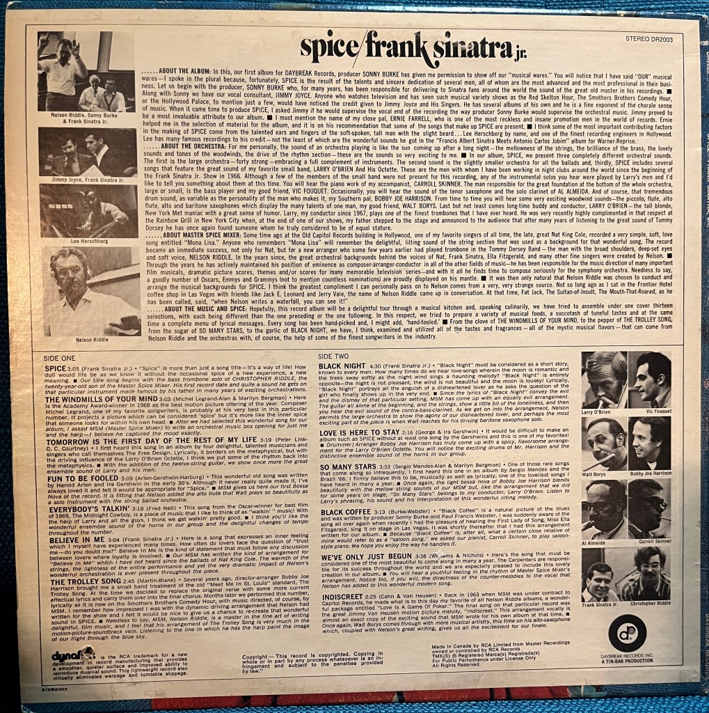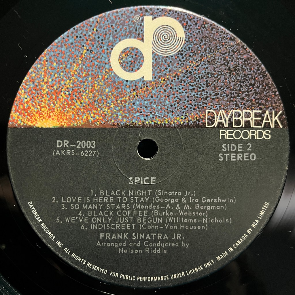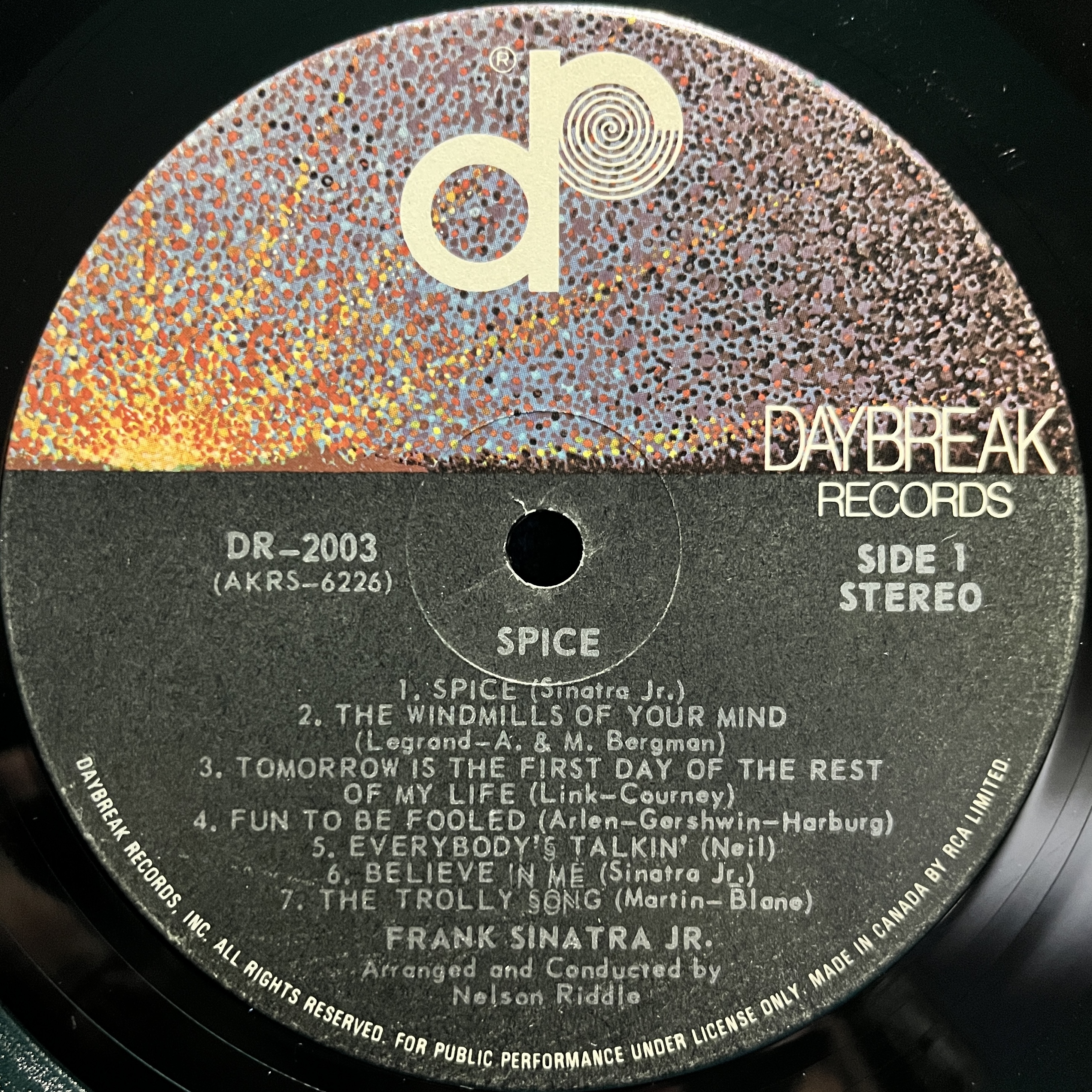 Today we are talking about Frank Sinatra, Jr.’s second album, Spice from 1971 and we can start by talking about Daybreak Records. Noted record man Sonny Burke is another Vintage Leisure player to be born in Pennsylvania. He had been a writer-arranger for the big bands and then teamed with Peggy Lee to write the songs for Disney’s Lady and the Tramp; a score that had some historical impact on the music business. He then focused on A&R and became musical director of Warner Bros. Records and Reprise Records where he produced the bulk of Frank Sinatra’s classic releases for that label. In 1970, he added record label owner to his CV when he worked out a deal with RCA Records to subsidise his new label, Daybreak Records. Very little can be found about this label but for it’s brief existence in the early 1970s it released albums by Bing Crosby, Count Basie and Crosby and the Count’s collab Bing ‘N Basie and Laurindo Almeida. An interesting little side trip in the record business, Burke’s short-lived side gig is a footnote, a little weathered road marker on our trip through the mists of the past.